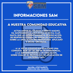 1️⃣ Suspensión temporal de la aplicación de la Ficha CLAP: En este momento, hemos decidido suspender temporalmente la aplicación de la Ficha CLAP. Esta medida ha sido tomada hasta que recibamos una respuesta formal por parte de la Superintendencia de Educación, en relación al protocolo aplicado a dicha encuesta. Estamos comprometidos en garantizar una aplicación transparente y eficiente de esta herramienta.
